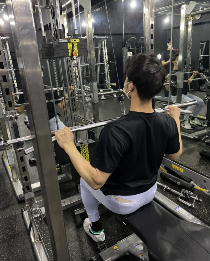 • ベンチに座り背筋を伸ばして、ダンベルを両手で持ち上げる。