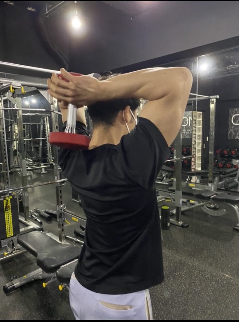 • 両手でダンベルを持ち、頭の後ろでセットする。
