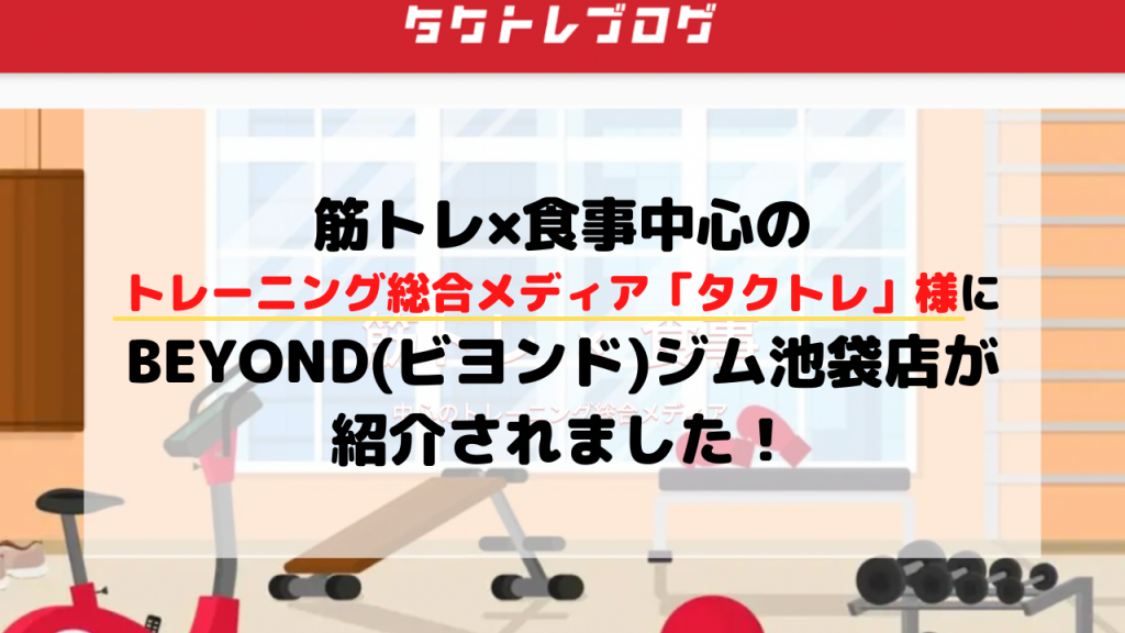 今回は、筋トレ×食事中心のトレーニング総合メディア「タクトレ」様がBEYOND(ビヨンド)ジム池袋店のトレーニングを体験されたのでご紹介したいと思います。